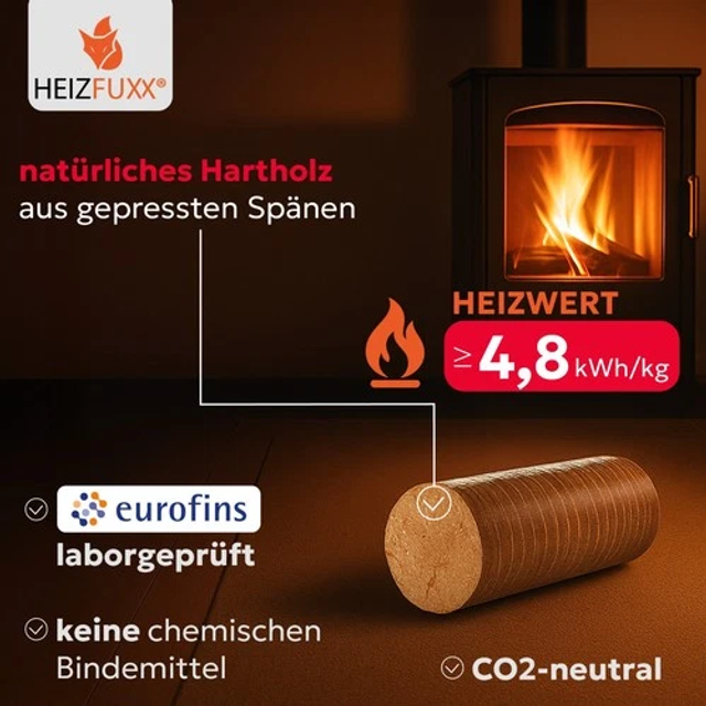 2 Briketts entsprechen ca. 3 Holzscheiten, sodass Sie die gewohnte Wärme eines Kaminfeuers genießen können, jedoch mit weniger Aufwand und nachhaltiger.